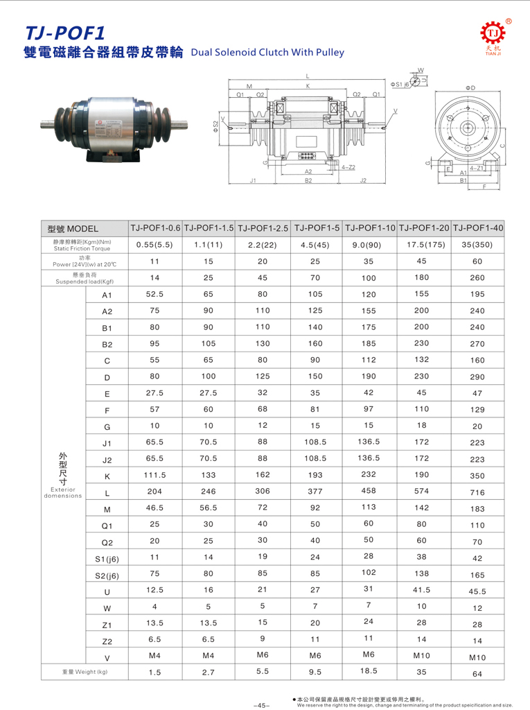 以下是雙電磁離合器帶皮帶輪,雙電磁離合器POF1型選型參數圖