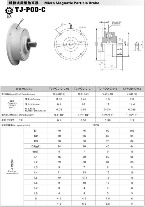 小型磁粉制動器國內標準規格:TJ-POD-C-0.05KG、0.1Kg、0.2KG、0.5KG。其中“KG”可以轉換為表“Nm”的單位,即1KG≈1Nm。