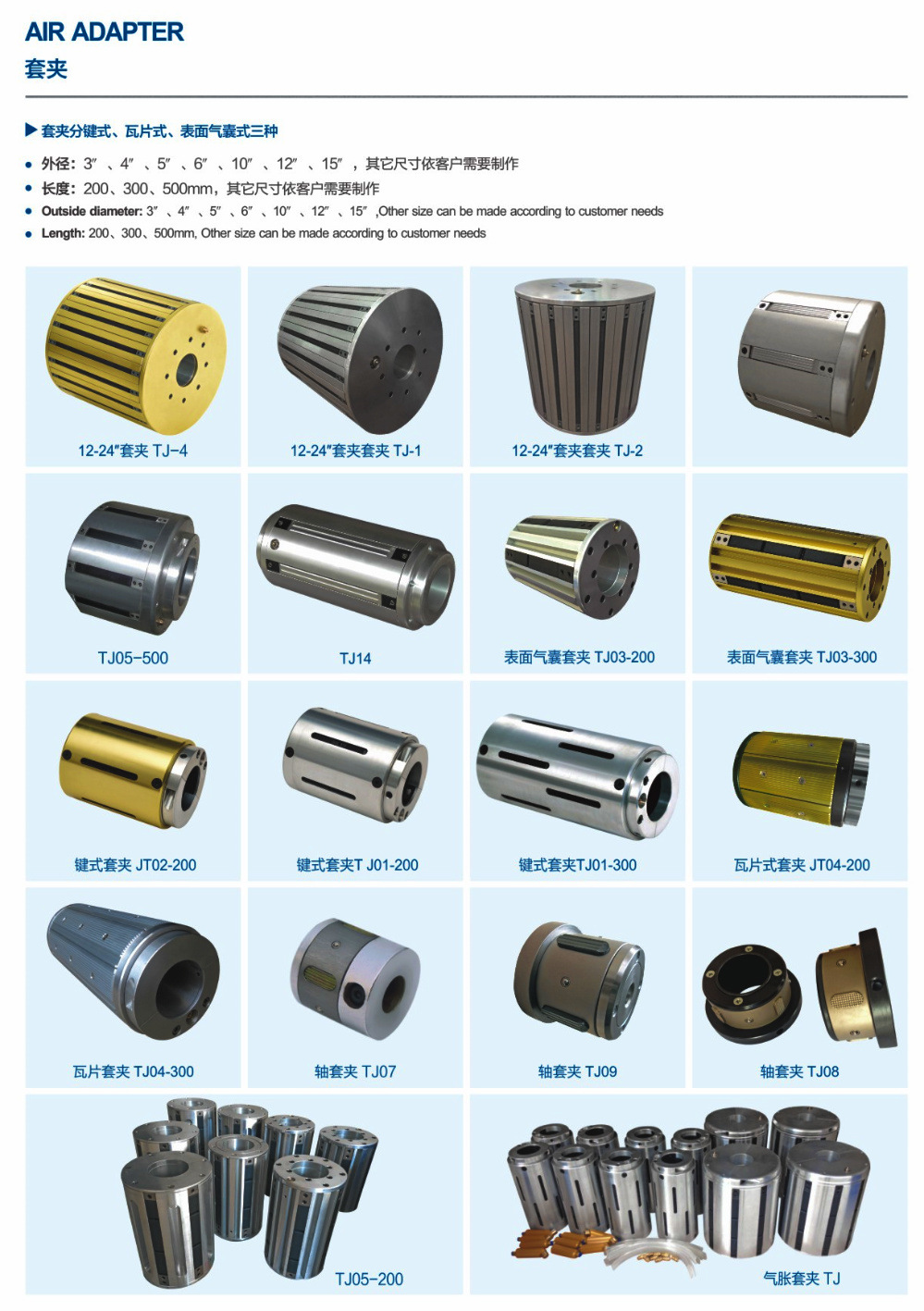 鋁合金板條式氣脹套夾,鋼制瓦片式氣脹套夾適用于涂布、分切、印刷、復卷、復合、造紙、塑料等相關機械的收放卷軸,適用于其它機械設備的有:涂布機、皮革機、定型機、壓花機、分條機、模切機、復卷機、復卷機、紙筒機、貼合機、覆膜機、吹膜機、發泡機、淋膜機、壓紋機、造紙機、無紡布機、驗布機、燙金機、電池設備等相關機械配套之使用。